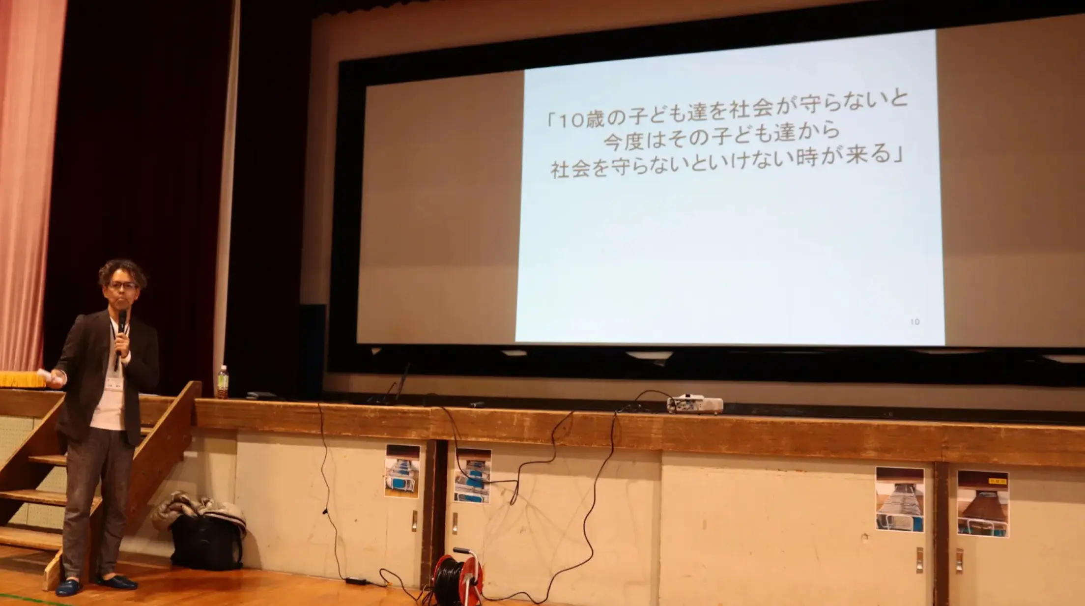 講演は 1時間半。とはいえ、子どもたちが最後まで集中できるように、途中で45分ほどで休憩 をはさみ、前半・後半に分けて進行しました。