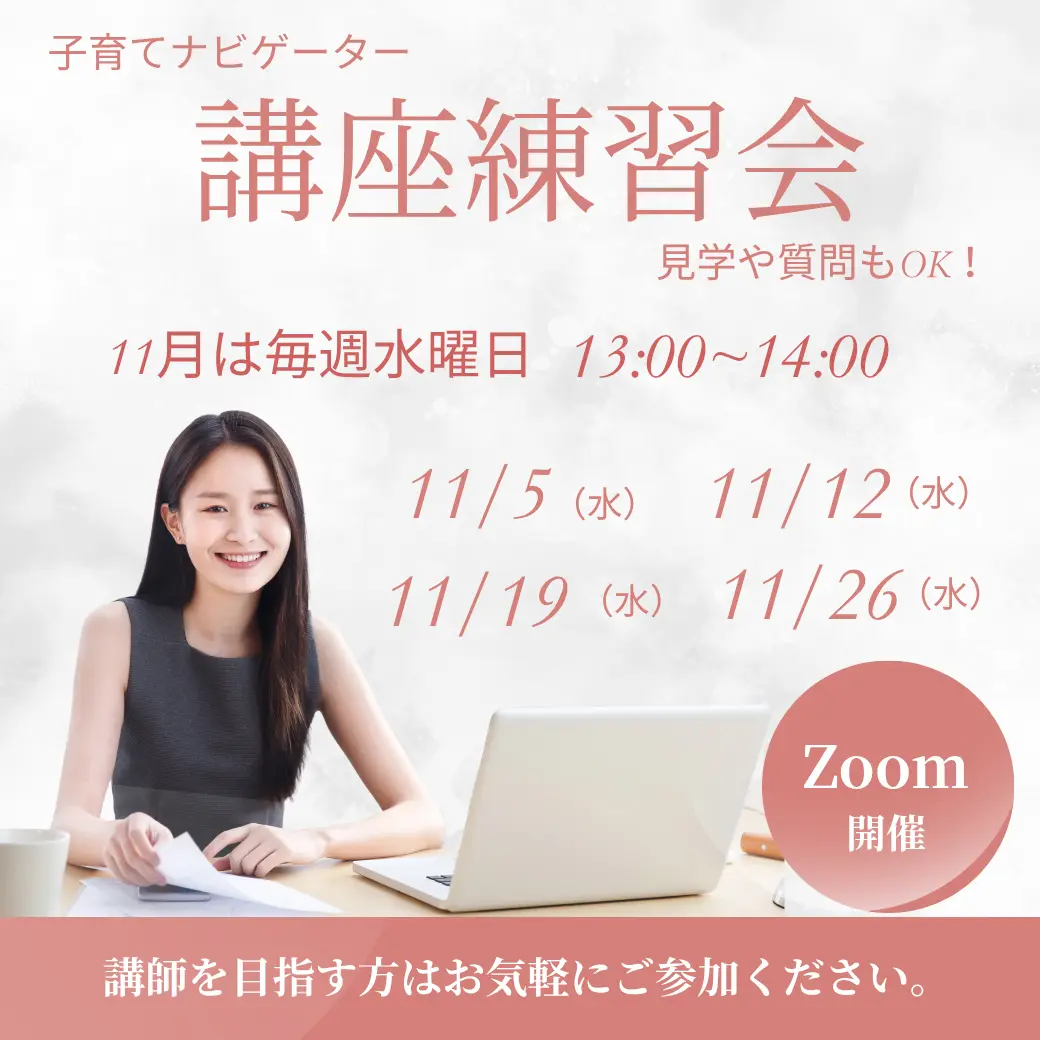 子育てナビゲーター養成講座では、週に1回講座練習会をZoomで開催しています。